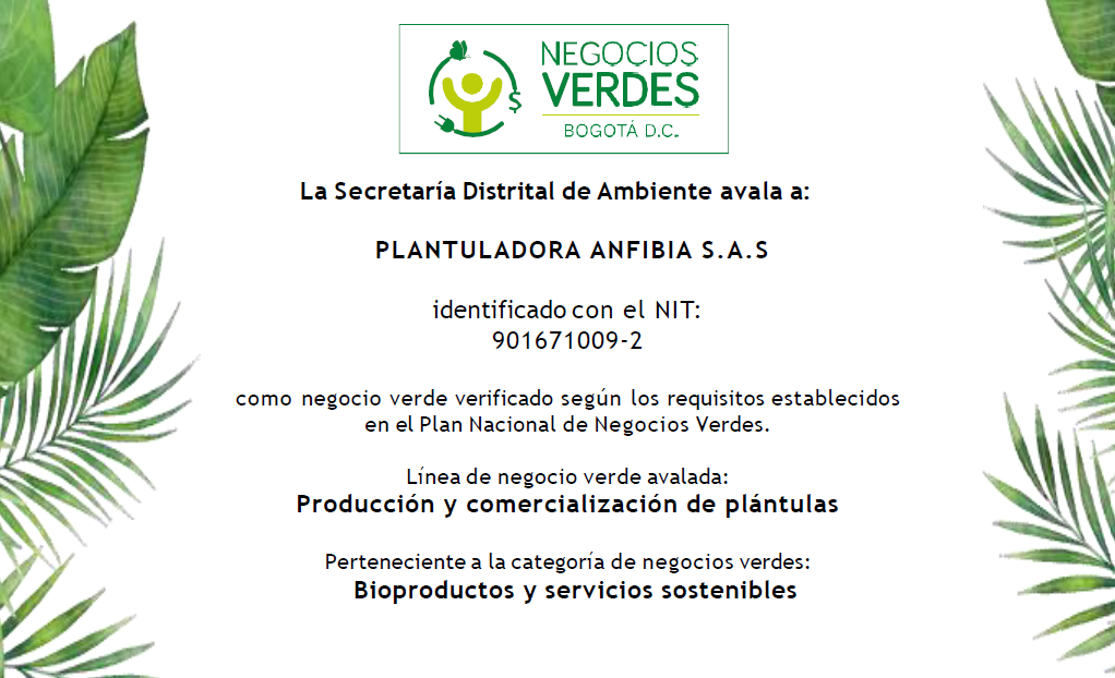 El 26 de diciembre de 2024, la Secretaría Distrital de Ambiente de Bogotá avaló a Anfibia Plántulas como un negocio verde.